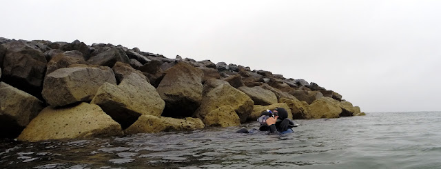 I snapped on my uber sexy gloves, hood and wetsuit socks and we headed down to the water (after going flying on some slippery seaweed-y rocks - not even in the water yet and I nearly die, typical). Mark explained the process, a few signals we had to do and how to work the snorkel. He made me try to breathe with it in my mouth and then shove my head under the water to test it out. When we decided we were good to go we popped on our flippers and had a little swim to get us started. I kept forgetting to stand up you have to roll onto your back and not literally stand because the flippers won't allow you to do that, but I sussed it in the end.